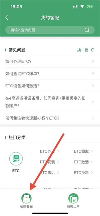 3、进入我的客服页面后,找到底部的在线客服选项并点击,进入智能客服界面。