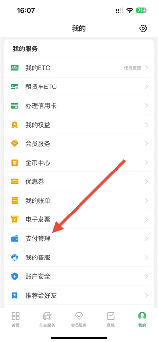 2、在我的界面中,找到支付管理选项并点击,跳转至支付管理相关页面。