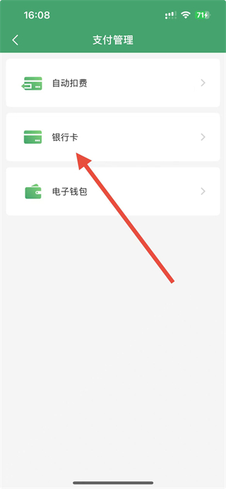 3、进入支付管理页面后,选择银行卡选项,进入我的银行卡操作界面。