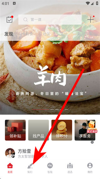 1、打开方太幸福家,点击底部知食,进入知食页面。