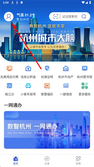 1、打开杭州城市大脑APP后,点击左上角的用户图标,进入用户界面。