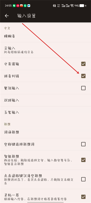 4、找到拼音纠错选项,点击复选框将其勾选。