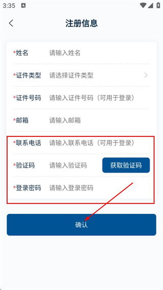 5、继续填写联系电话-验证码-登录密码,点击确认完成个人账号注册。