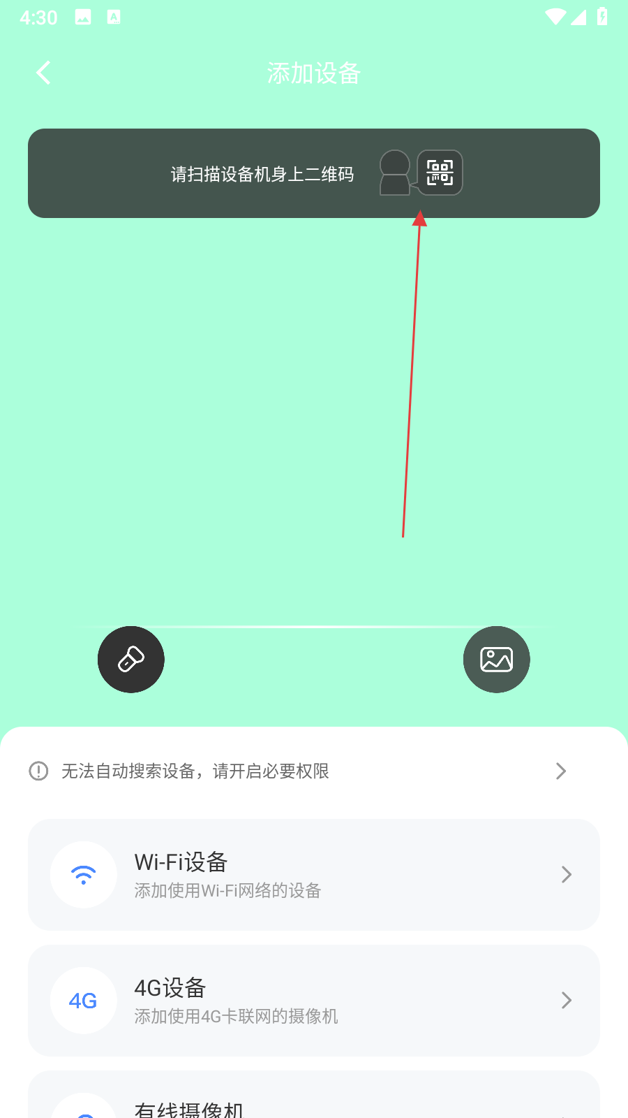2、进入添加设备页面后,若设备机身上有二维码,使用手机摄像头扫描设备上的二维码来添加设备。