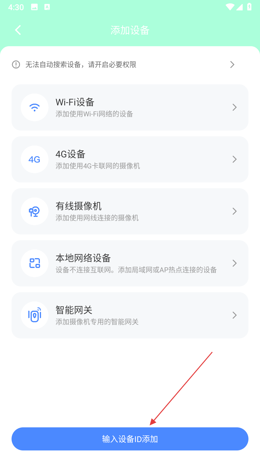 3、若无法通过扫描二维码添加,可在添加设备页面下方,点击页面底部的输入设备ID添加按钮,在弹出的输入框中准确输入设备的ID号。
