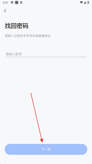 2、输入注册手机号码或邮箱地址,再填写账号后点击下一步。