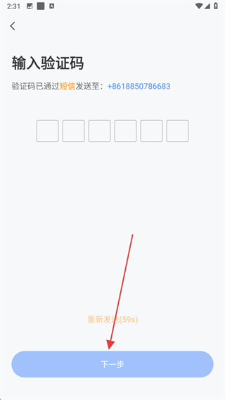 3、进入输入验证码页面,将收到的验证码填入后点击下一步。