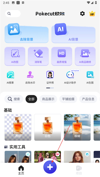 1、打开Pokecut快咔应用,进入主界面,点击底部中间的蓝色+号按钮,准备选择要编辑的图片。