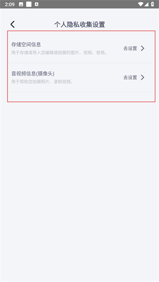 4、在个人隐私收集设置页面选择对应权限,点击去设置完成系统权限管理。