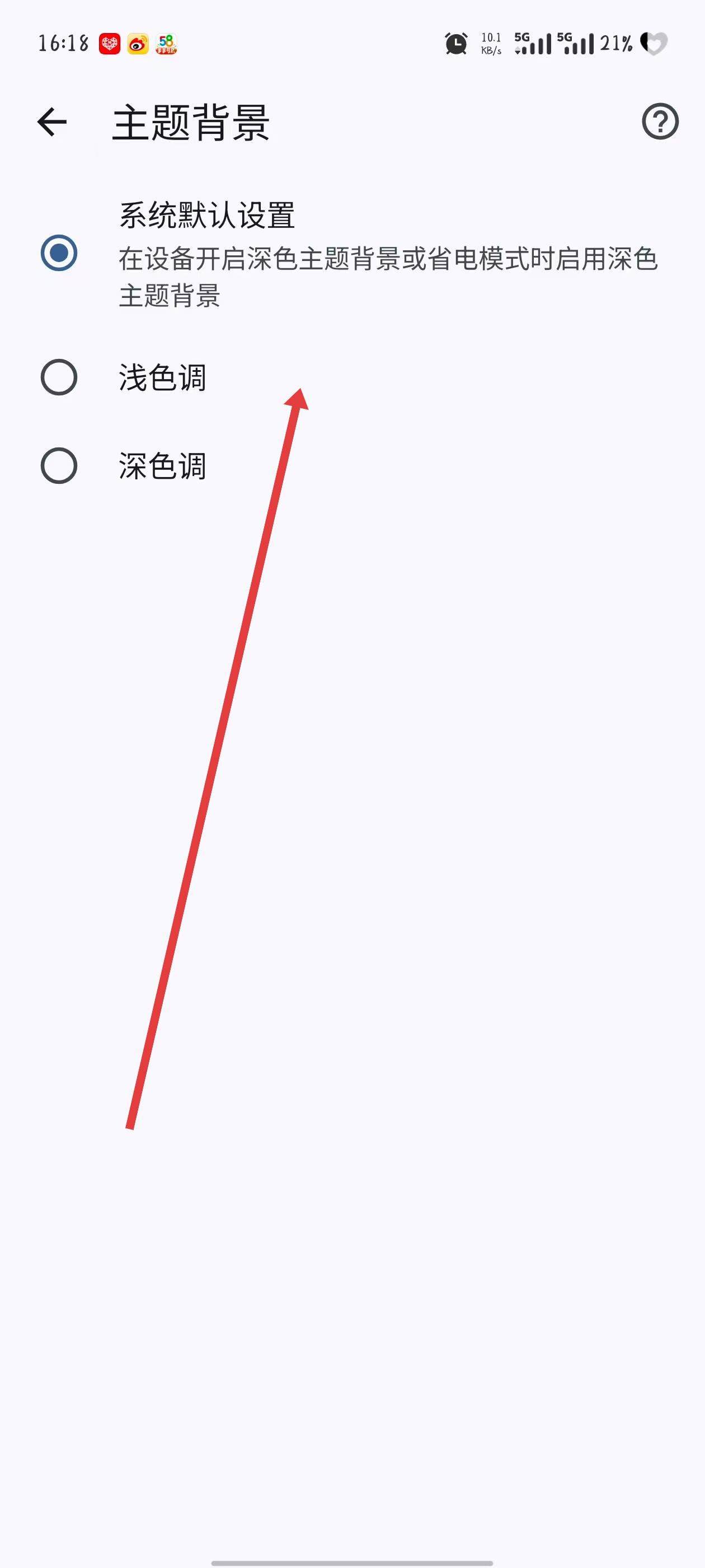 3、进入主题背景设置页面后,可选择系统默认设置浅色调或深色调,点击相应选项前的圆圈,即可应用对应的主题背景。