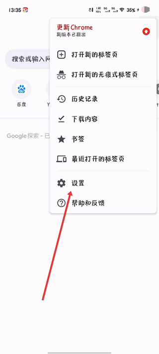 1、打开谷歌浏览器,在弹出菜单中选择设置。