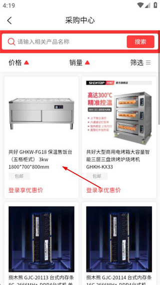 2、在采购中心页面,点击目标商品,进入商品详情页。