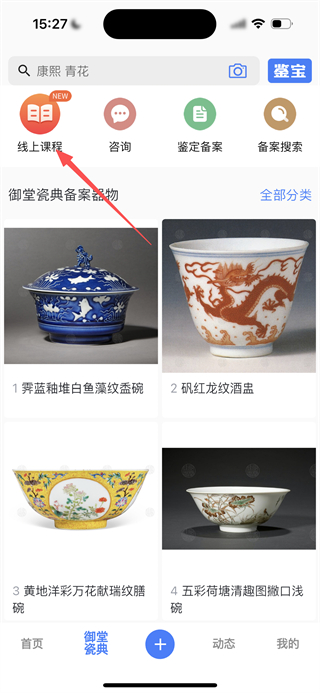 2、在御堂瓷典页面,点击线上课程选项,进入课程详情页。