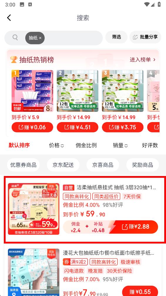1、打开京粉app,在首页的搜索栏中输入想要推广的商品关键词,比如抽纸,点击搜索,浏览搜索结果,找到想要推广的商品。