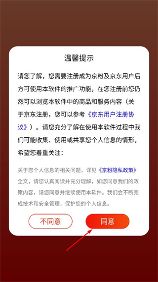 1、打开京粉APP后,查看弹出的温馨提示及相关政策内容,确认后点击页面中的同意按钮。