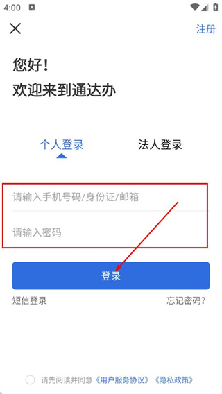 4、在登录页面,填写手机号码/身份证/邮箱和密码,点击登录,完成账号登录。