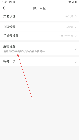3、在账户安全页面点击解锁设置选项,进入解锁设置页面。