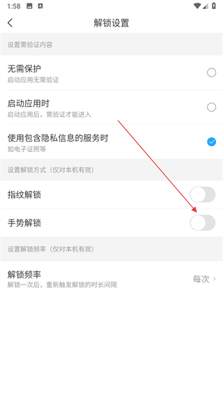 4、在解锁设置页面点击手势解锁右侧的开关按钮将其开启。