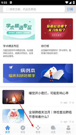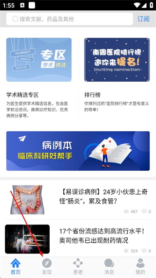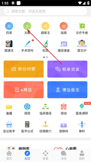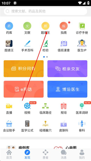 1、打开医库app的首页,点击底部导航栏的发现,进入功能集合页面。