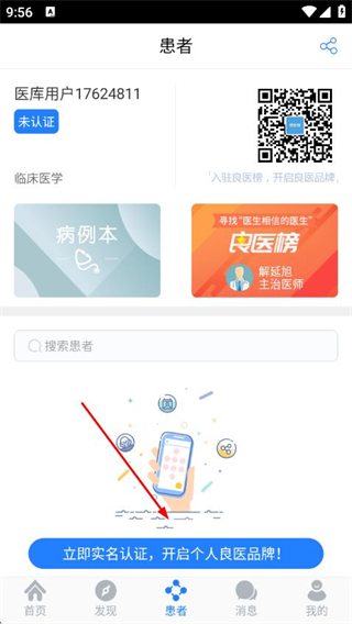 2、在患者页面点击立即实名认证,开启个人良医品牌,进入实名认证页面。