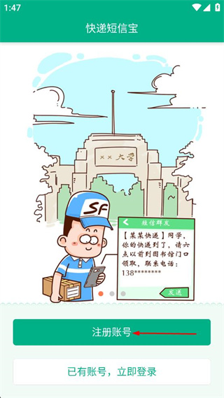 1、打开快递短信宝软件,查看服务协议和隐私政策弹窗,点击界面中的“同意”按钮。