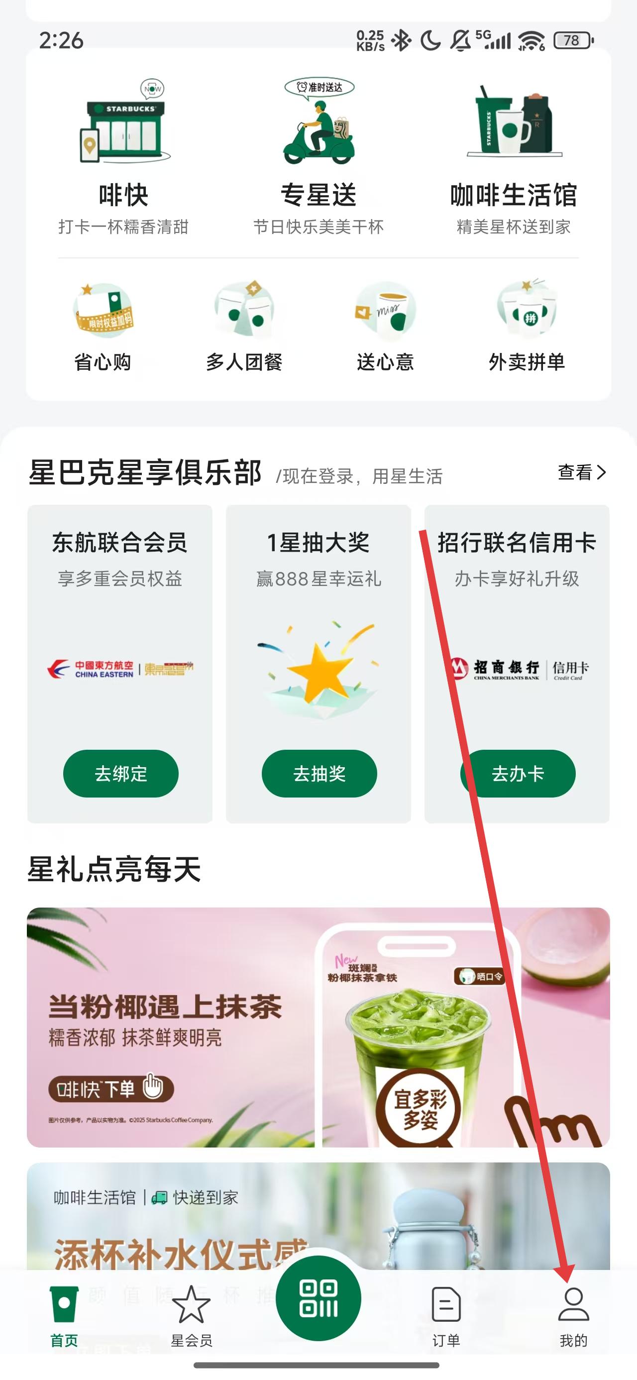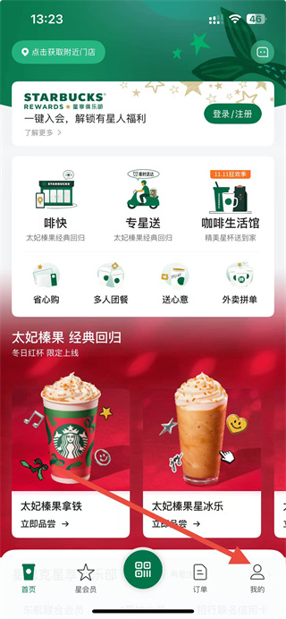 1、在星巴克中国app首页,点击右下角我的选项,进入个人页面。