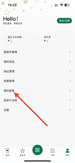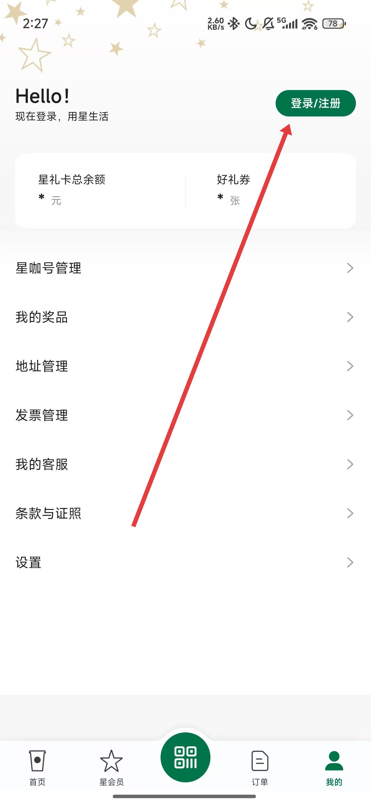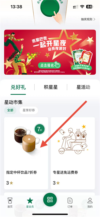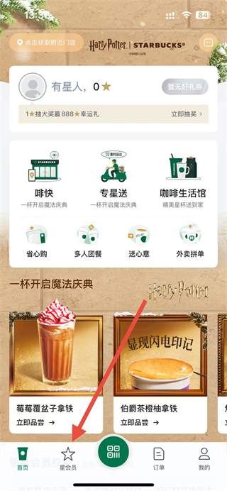 1、打开星巴克app,点击底部的星会员选项,进入星会员页面。
