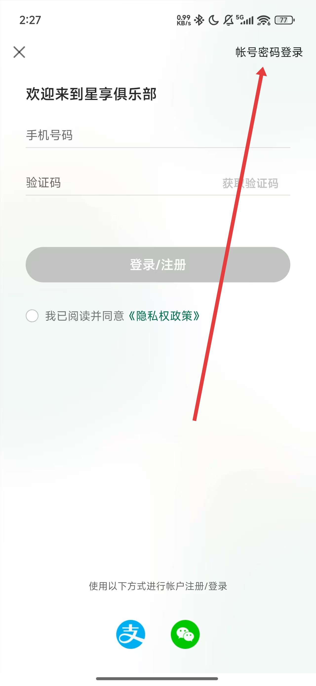3、在跳转到登录页面后,可以点击右上方账号密码登录按钮,切换登录方式。