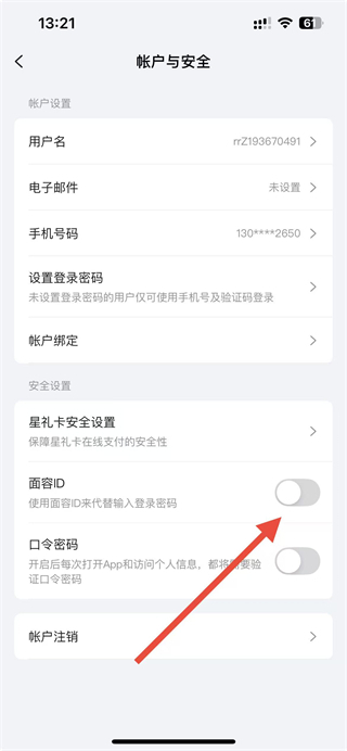4、在帐户与安全页面,找到面容ID对应的开关并开启,即可设置面容登录功能。