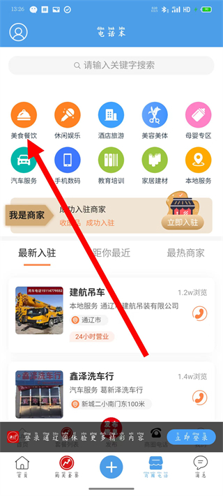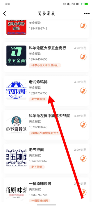 2、在商家电话页面,点击美食餐饮分类,进入列表页面。