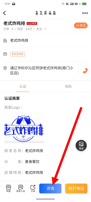 4、在商家详情页面,点击咨询,与商家或网友互动交流、分享经验。