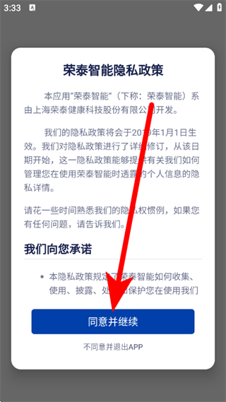 1、打开荣泰智能,在隐私政策弹窗中,点击同意并继续。