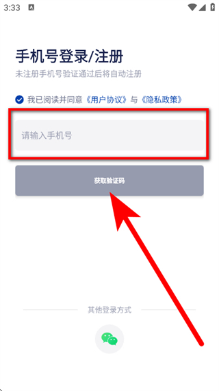 2、在手机号登录注册页面,输入手机号,点击获取验证码。