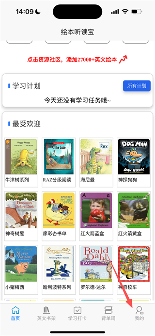 1、在绘本听读宝首页,点击底部的我的选项,进入个人中心页面。