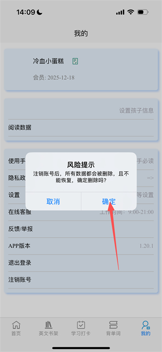 3、在风险提示窗口,点击确定按钮,即可完成账号注销操作。