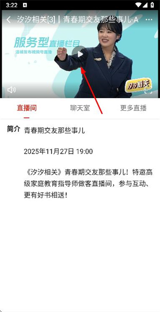 3、在直播详情页面点击视频播放按钮,即可观看直播回放。