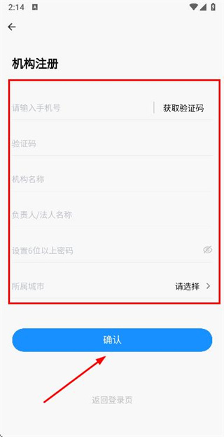 3、在机构注册页面填写对应信息后,点击确认完成注册操作。