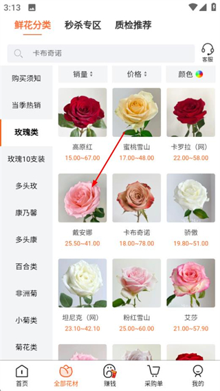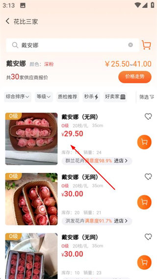 2、在玫瑰类页面,点击目标花材如戴安娜,进入花材比价页面。