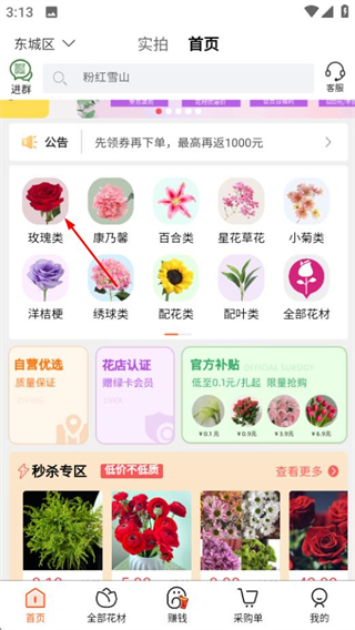 1、在花比三家首页,点击玫瑰类选项,进入玫瑰类花材页面。