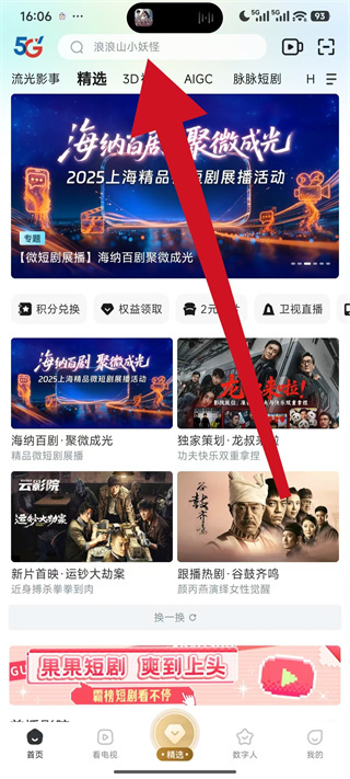 1、打开天翼视讯,点击首页顶部,进入搜索界面。