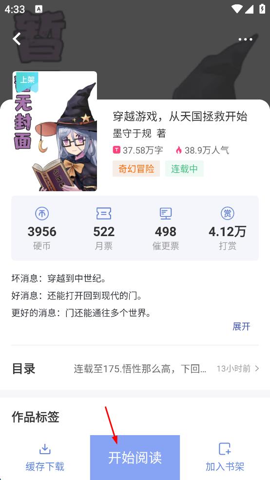 3、在小说详情页面,找到“开始阅读”按钮并点击,进入小说阅读界面。