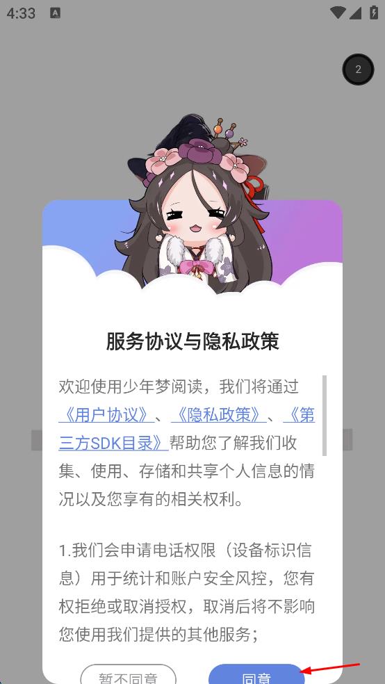 1、打开少年梦阅读APP,弹出服务协议与隐私政策窗口,阅读后点击“同意”按钮,进入APP主界面。