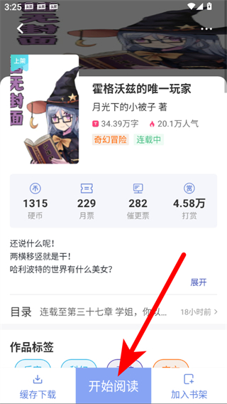 2、在小说详情页面,点击开始阅读按钮,进入阅读界面。
