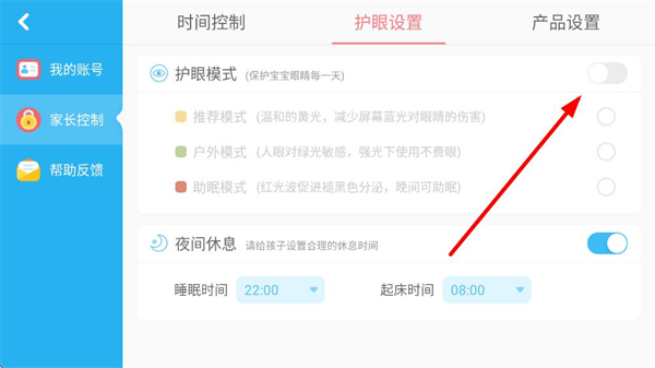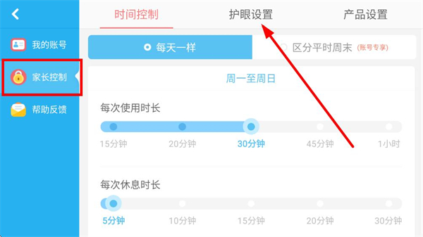 3、点击进入家长控制页面后,点击顶部的护眼设置标签,切换到护眼设置界面。