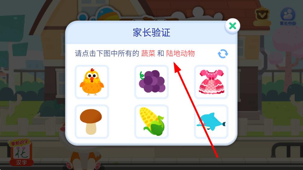 2、在弹出的家长验证界面,按提示选择对应的物品完成家长验证。