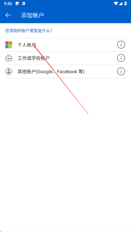 2、在选择账户类型页面,根据需求点击个人帐户,工作或学校帐户或其他帐户,进入对应添加方式选择界面。