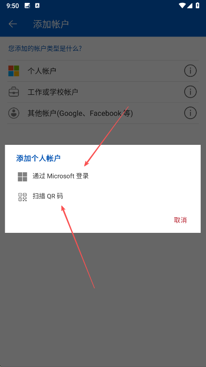 3、选择个人帐户,在添加方式选择界面点击扫描QR码或点击通过Microsoft登录,即可成功添加账户。