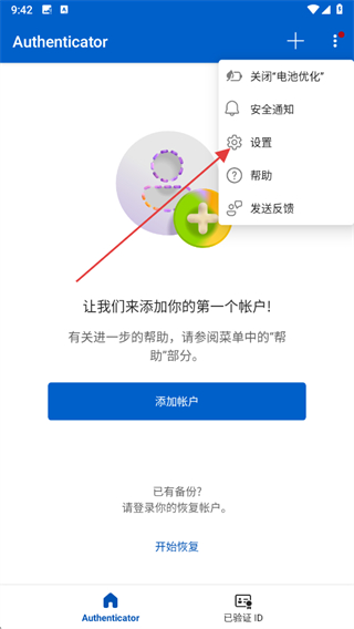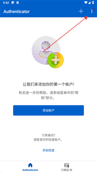 1、打开微软身份验证器主界面,点击三点图标,展开功能菜单列表。