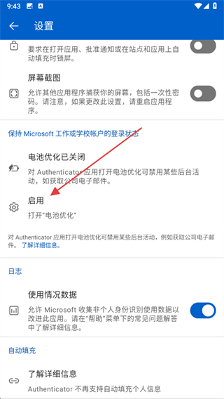 3、在设置页面里找到电池优化相关选项,点击启用按钮触发权限弹窗。
