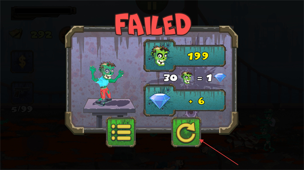 4、若被僵尸击败,界面会显示FAILED,点击右侧循环箭头按钮可重新挑战当前关卡,积累的资源会保留。